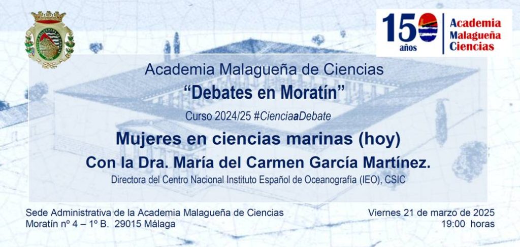 Málaga, sábado 15 de marzo de 2025. El próximo viernes 21 de marzo, a las 19:00h, la Academia Malagueña de Ciencias celebra una sesión pública en su sede social (C/Moratín, nº 4, 1ºB, 29015 Málaga) en el marco de los “Debates en Moratín”, en la que interviene la Dra. Mª Carmen García Martínez para exponer sus opiniones sobre “Las mujeres en las Ciencias Marinas hoy”. La presentación de la ponente corre a cargo del académico Dr. Juan A. Camiñas.